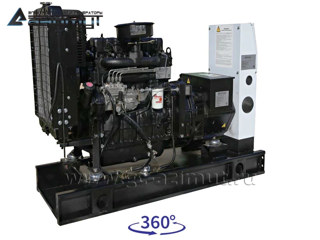 - первичного четырехцилиндрового дизельного двигателя водяного охлаждения с механической регулировкой частоты вращения AZIMUT 4R360D, объемом 3,61 литра и номинальной мощностью 30 кВт, с промышленным глушителем и стандартным радиаторным блоком охлаждения,