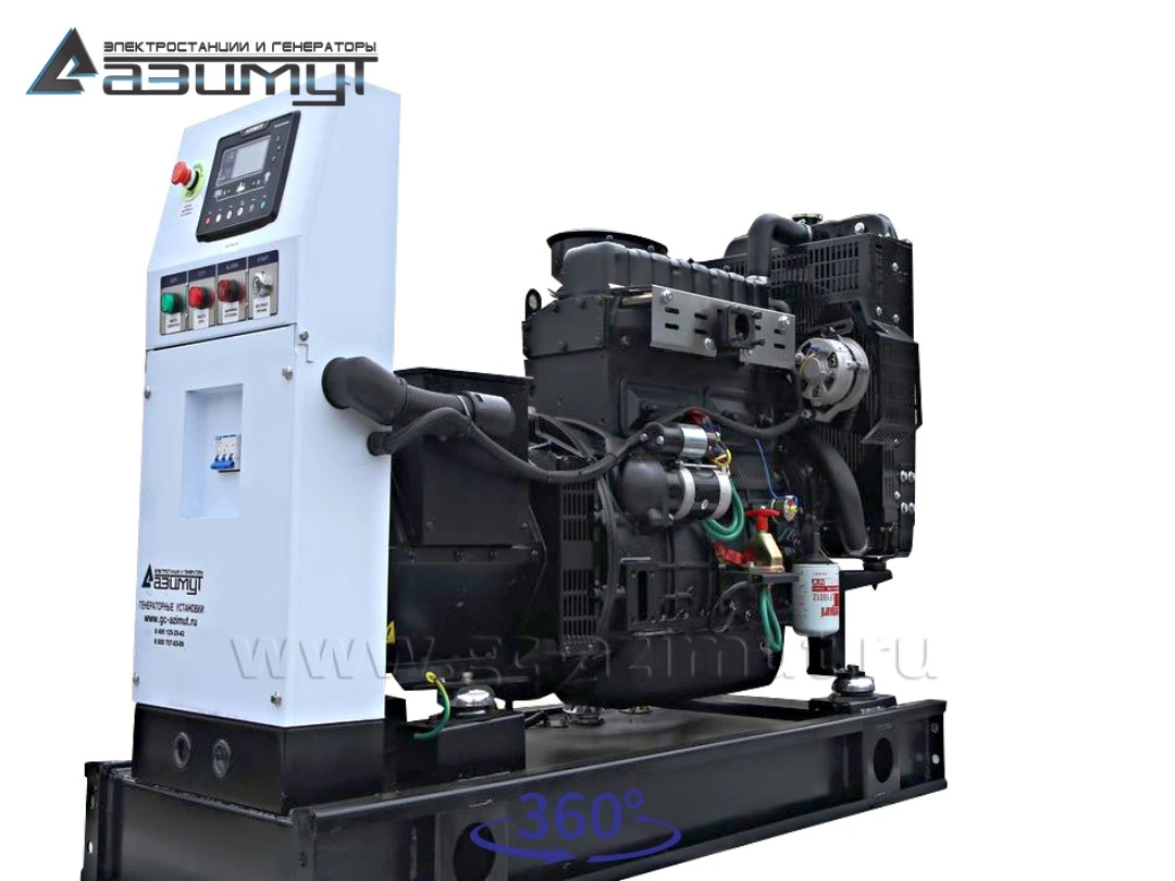 - первичного четырехцилиндрового дизельного двигателя водяного охлаждения с механической регулировкой частоты вращения AZIMUT 4R360D, объемом 3,61 литра и номинальной мощностью 30 кВт, с промышленным глушителем и стандартным радиаторным блоком охлаждения,