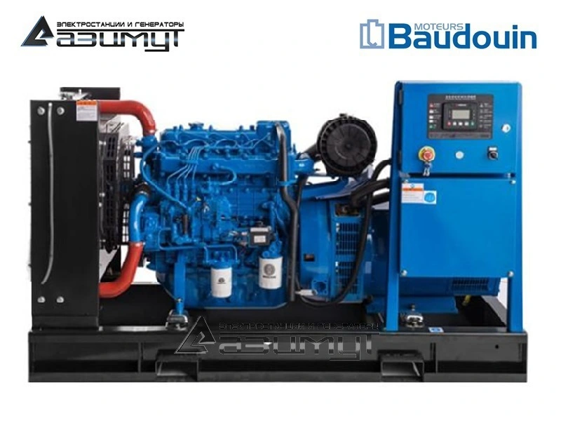 - первичный четырехцилиндровый двигатель водяного охлаждения BAUDOUIN MOTEURS 4M11G90/5e с промышленным глушителем и радиаторным блоком охлаждения,