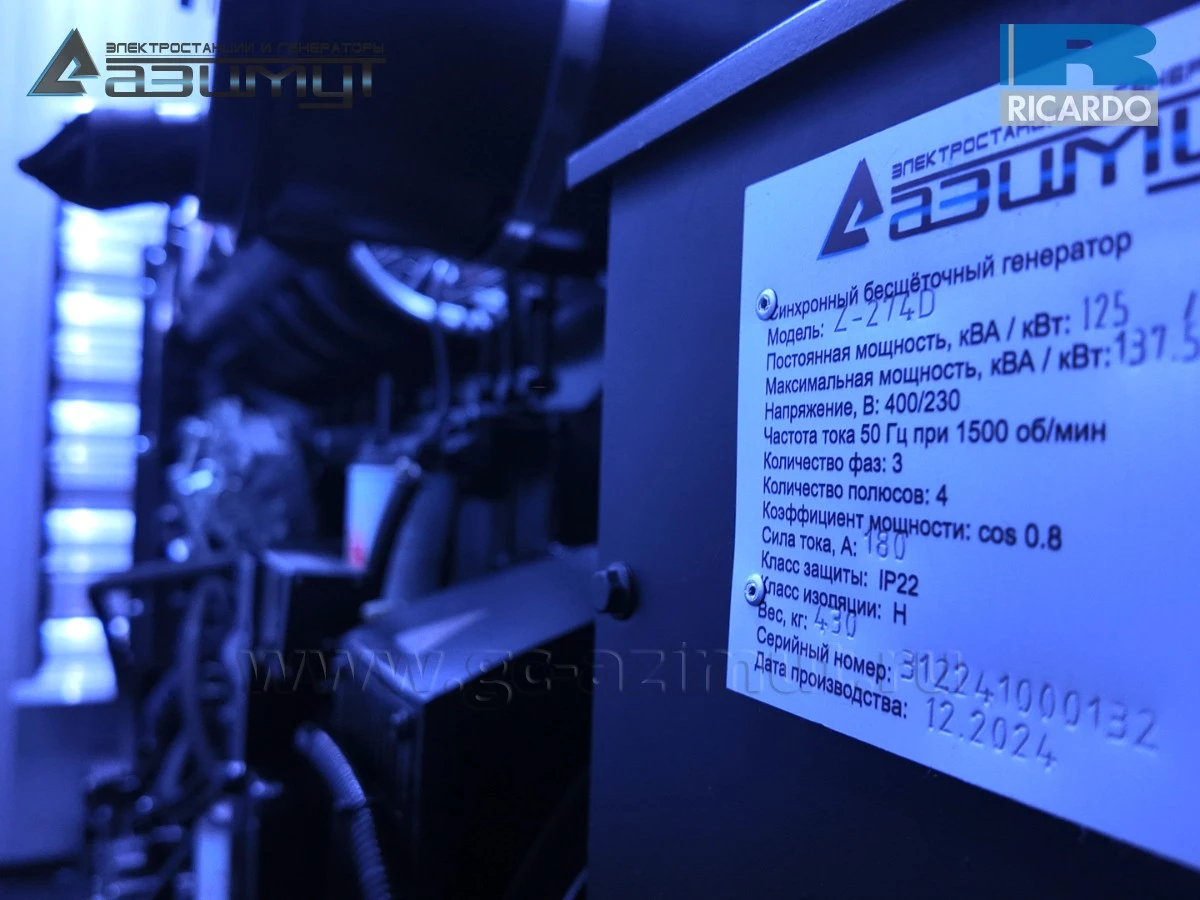- синхронного бесщеточного 3-фазного генератора на 380 В AZIMUT Z274D номинальной мощностью 100 кВт c автоматической регулировкой напряжения,